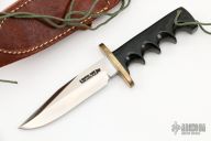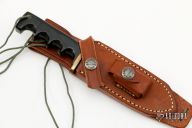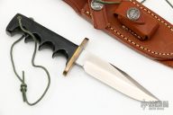 This is a miniature version of Randall's Model 14 Attack. The Model 14 was designed to meet the demand for an almost indestructible all-purpose knife, though it is especially suited for combat and survival purposes. #757. Satin finished blade with sharpened top edge, .172" blade stock and .815" blade depth, full tang construction. The handle has a brass guard and black linen micarta grip, lanyard hole at the butt. Knife is in excellent condition. Comes with original brown leather sheath and a zippered case.