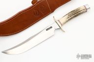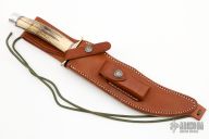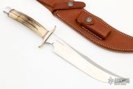The RKS4 is the fourth club knife made by Randall Knives for the Randall Knife Society. The blade is etched "RKS 828/2986". Carbon steel blade with sharpened top edge, .226" blade stock and 1.285" blade depth, hidden tang construction. The handle has nickel silver guard, stag handle with red, white and blue spacers, and a duralumin butt. Comes with a brown leather sheath and zippered case. Excellent condition.