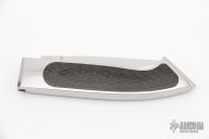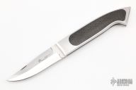 This Interframe Lockback by Charles Bennica features a mirror polished blade with nail nick. The handle has a mirror polished stainless steel frame with carbon fiber inlays, mirror polished stainless steel backspacer and butt which is the lock release. Nice lockup and blade seating. Excellent condition. Comes with a Velcro case.