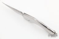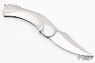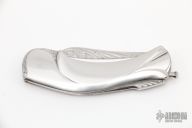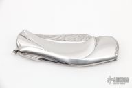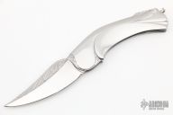This knife by Robert Weinstock features a hand rub satin finished blade with engraving. The handle has a stainless steel frame that has been carved and engraved, engraved stainless steel backspacer, has a lanyard bail. Comes with a zippered case. Excellent condition.