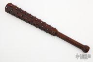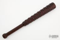 Ryan's love for creating historical pieces with his modern twists are evident in his Medium Tetsubo war club. This nearly 3 pound studded octagon smashers are made from 4" x 30" square blanks of hard maple.  The 8 facets of the octagon have evenly spaced fire scaled black iron studs. Every Tetsubo is marked with "Destiny" in kanji characters,Ryan's makers mark, and his 2022 mark.  Each one is shaped using power carving techniques, then hand sanded and finished with a hand rubbed, home brewed, old school finish.  If needed, the finish can be easily maintained with a coat of black furniture wax periodically to restore the elegant depth.  These are another great addition to your RMJ war chest!
