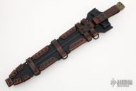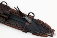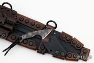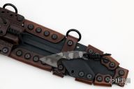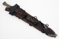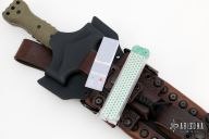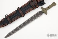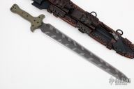 This Custom M-18 Sword by Miller Brothers Blades features a double edged blade, .269" blade stock and 2.361" blade depth, full tang construction. The handle has textured green G-10 scales with hex screw fasteners and gray G-10 liners, has notched on the tang for grip. Comes with a kydex/leather sheath that has two auxiliary pockets, one holds a diamond sharpener, the other is empty, it also as a secondary blade attached as well. The secondary small knife has a textured handle, .254" blade stock and 1.181" blade depth. New from maker. Comes with a COA for both knives.