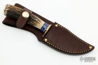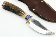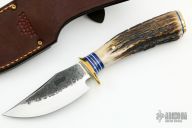 This Hunter by Rocco Handmade features a satin finished hollow ground blade with hammer marked flats, .119" blade stock and 1.306" blade depth, hidden tang construction. The handle features a brass guard and butt, blue/white/brass spacers, and a stag grip with brass pin. Great look and feel. Comes with a Treeman brown leather sheath. New from maker.
