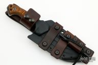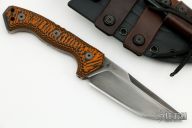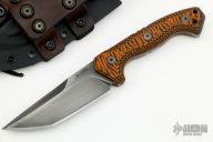 This M-26 by Miller Bros Blades features a drop point blade with sharpened top edge, .223" blade stock 1.404" blade depth, full tang construction. The handle has textured orange/black G-10 scales with lanyard holes, extended tang. Comes with a kydex/leather sheath and COA. New condition.