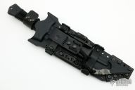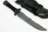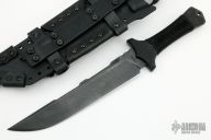 This M-17 by Miller Bros Blades features a carved blade with false top edge, .279" blade stock 2.061" blade depth, full tang construction. The handle has textured black G-10 scales with cord wrap, lanyard holes, extended tang. Comes with a kydex/leather sheath that has an auxiliary pocket that holds a diamond sharpener, it also as a secondary blade attached as well. The secondary small knife has a textured handle, .254" blade stock and 1.195" blade depth. Comes with a COA for both knives. New condition.