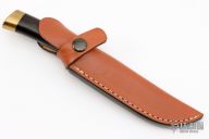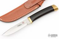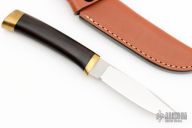 This knife by Hattori features a satin finished drop point blade with false top edge, .156" blade stock and .775" blade depth, hidden tang construction. The handle has a brass guard and butt, ebony grip with black spacers. Comes with brown leather sheath and the original box and papers. New condition.