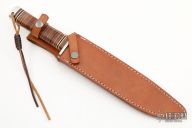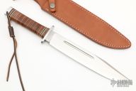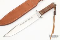This Big Bowie Hunter by Ichiro Hattori features a satin finished blade with a false top edge and fullers, .265" blade stock and1.542" blade depth, hidden tang construction. The handle has a stainless steel guard and aluminum butt, and a stacked leather handle with white and black spacers. Comes with original box, papers and brown leather sheath. New condition.