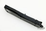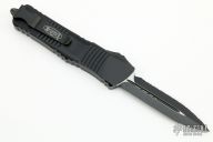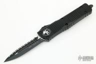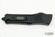 This Combat Troodon OTF automatic by Microtech knives features a black double-edged double blade with one fully serrated edge, and a black aluminum handle with black hardware, tip down carry. Glass breaker. S/N 38092. Dated 04/2022. Comes with original box and papers. Excellent condition.