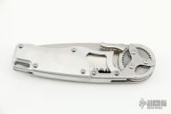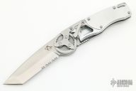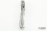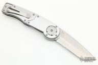 This is a knife from the GH-Series Gearhead folding knife by Mantis Knives. The "steampunk-style" Gearhead liner lock folder is equipped with a unique gear-driven pivot with one large gear, three small gears and a thumb lever used to deploy the blade when pushed down. It features a flat 3.38" plain edge tanto blade and measures just under 5" when closed. The gray handle scales are made from aluminum with a stainless steel backspacer and tip-up pocket clip. The GH2018TS Gearhead comes in a satin finished blade but is available in a variety of styles and finishes.