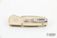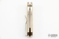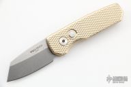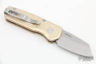 This Runt by Pro-Tech features a stonewashed Magnacut blade.  The handle features a textured bronze aluminum frame with milled thumbrest, a stainless steel tip up pocket clip and a mother-of-pearl push button.  Comes with original box and papers. New from maker.