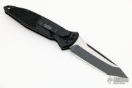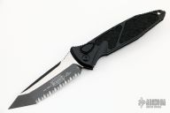 This Socom Elite Auto has a two-tone tanto fully serrated blade with notched thumbrest. Black aluminum handle with non-slip inserts. Stainless steel clip, tip down carry. Glass breaker. Dated 06/2022 and s/n 7886. Comes with original box and papers. Excellent condition.