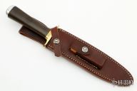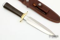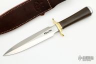 This Model 2-7 by Randall Made knives features a satin finished double edged blade, .215" blade thickness and 1.310" blade depth, hidden tang construction. The Model 2 is a heavily made dagger or dirk. brass guard and duralumin butt, green linen micarta grip with black spacers. Comes with a brown leather sheath. Excellent condition.