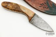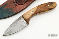 This Hunter features a Russian Damascus drop point blade with a full tang construction. .158" Blade Stock.  1.202" Blade Depth. The handle features wood scales.  Includes a leather sheath.  Oxidation is visible on the blade. There is separation between the scales and the tang. New from maker!