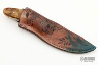 Along the way I realized I now had the tools to build my own knife blades. I work with steel, but work it hard and slow so do not do tempering. I still often buy good blades from a blade maker, and think I prefer the stories told in the handle materials best. I do my own acid etched scenes in the steel. I?m now maybe one of the experts on raw material, doing identifications for museums, restorations , appraisals, as well as doing my own art and supplying others. I have 9 buildings full of raw materials now. ?Truckloads? I have customers from all over the world come find me in Nenana Alaska on a pilgrimage to look over my materials, who are not disappointed. So I have lots to choose from when building a knife. I stopped counting my custom one of a kind art pieces at 10,00 items over 10 years ago. I?m a full time artist.