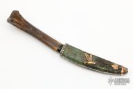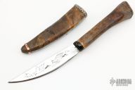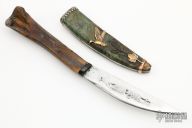 This knife features a polished and acid etched blade with whale bird theme and a hidden tang construction.  .067" Blade Stock.  .764" Blade Depth.  The handle features a bog oak guard and ice age bone grip.  The sheath is stabilized old Alaska wood sterling silver trimming.  Pinned custom brass and copper duck. New from maker!