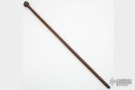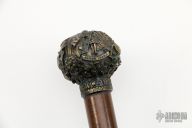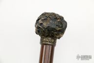 This is a nice vintage Dewars Scotch advertising cane with the Dewar Scottish Highlander on it and the banner reads "Never Varies". The walking stick or cane is made of what looks like bronze or high quality cast brass. It is in the shape of a globe and has a coat of arms, lions and other game animals along with the Dewar Scottish Highlander. The cane top reads Dewar Highlander around the collar. Often carried as a defensive cane due to its heavy top. Excellent condition for its age.