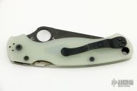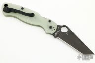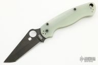 This G81GM4BKP2 Paramilitary 2 by Spyderco features a black tanto blade with thumb hole, notched thumb ramp and choil. The handle has a textured jade G10 scales over a stainless steel subframe and lockbar. 4 way adjustable pocket clip and lanyard tube in pommel. Has a couple light scuffs, otherwise excellent condition.