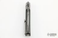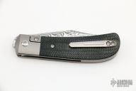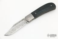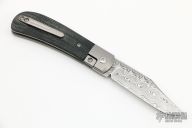 This Trapper Front Flipper by Enrique Pena features a Damasteel blade with a front flipper and notched thumbrest. The handle has titanium bolsters, black canvas micarta scales with a titanium backspacer and matching tip up pocket clip. Excellent condition.