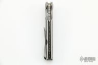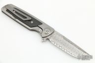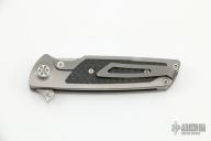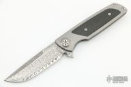 This Micro Typhoon flipper from Brian Nadeau/Sharp by Design features a Damasteel Blade with swedge. The handle features fine bead blasted titanium scales with carbon fiber inlays. Matching titanium pocket clip and backspacer. Blade is centered when closed, flips well with no wrist action needed, and locks up with no play. Has a few light scuffs, otherwise excellent condition.