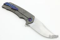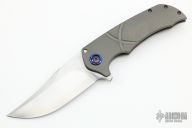 This Wyvern flipper from Walter Randolph features a hand rub satin finished blade with flipper and nice hamon (probably won't show up well in the pictures). The bead blasted titanium frame with white Timascus pivot collars, pocket clip, and floating backspacer. Pocket clip is positioned for tip up carry. Nice detent, lockup and blade seating. Excellent condition.