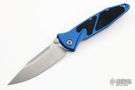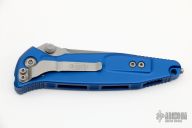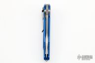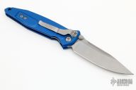 This Socom Elite manual linerlock folder by Microtech Knives has a stonewashed blade with notched thumbrest and dual thumbstuds. Has a blue aluminum handle with non-slip inlays, tip down blasted stainless steel clip. Serial number 7167 and dated 03/2020. Comes with a Microtech box and papers. Excellent condition.