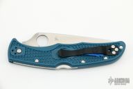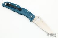 This Spyderco Endura knife has a dark blue FRN handle and a full-flat ground K390 steel blade that is satin finished with a plain cutting edge.