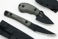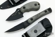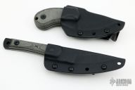 This Wolf Pup by Tops Knives features a black blade with notched thumbrest, .131" blade stock and 1.520" blade depth, full tang construction. The handle has black linen micarta scales with white liners. Comes with original kydex sheath. Excellent condition.
