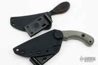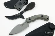 This Felony Stop is a Laci Szabo design produced by Tops, it has black linen micarta scales and white liners. Gray coated blade with both edges sharpened. Notched thumbrest. Includes black kydex sheath. Excellent condition.