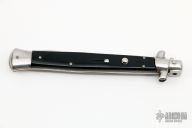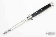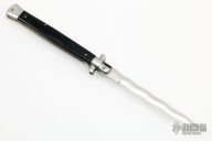 This Swivel Bolster from Stiletto Italy features a kris ground blade with false top edge. The handle is comprised of stainless steel bolsters and pommel with black scales over brass liners and stainless steel backspacer. Has a few light scratches, otherwise excellent condition.