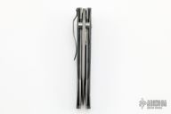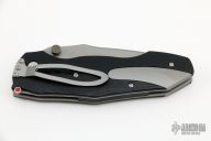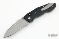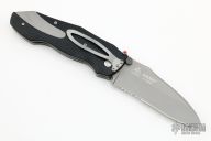 This Anubis Auto from CRKT features a bead blasted partially serrated blade with dual thumbstuds. The handle has black fiber scales with a stainless steel insert, stainless steel liners and tip down clip. Excellent condition. Comes with a nylon belt sheath.