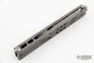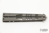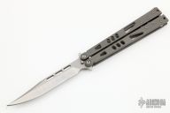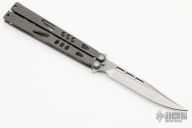 This Tachyon II balisong from Microtech has a stonewashed, clip point blade with swedge. The handle is comprised of skeletonized bead blast titanium handles with aluminum T latch on pommel. Dated 11/2012 and S/N 00400. Has a couple of light handling marks, otherwise excellent condition.