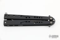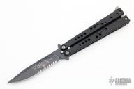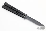 This Dragonfly balisong from Microtech Knives has a black partially serrated blade and skeletonized black aluminum handles. Dated 12/2002 and #845. Excellent condition. Hard to find.
