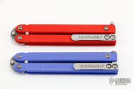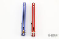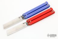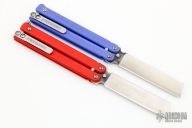 This pair of Razor Lite Balisongs by Atropos features a satin finished blade. The handles are have red and blue G-10 handles, tip up stainless steel clips. Excellent condition.