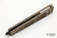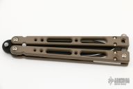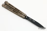 The Bear Song IV butterfly knife is the newest collaboration between BladeRunnerS (BRS) and Bear OPS. It is a lightweight flipper that is designed to be your go-to everyday carry knife. This B-400 model features anodized aluminum handles, stainless steel spacers and a swappable latch. The pivots have 304 bearing surfaces and phosphorus bronze washers. The black finished stainless steel blade has a double tang pin design for great performance. Has a few light scuffs, otherwise excellent condition.