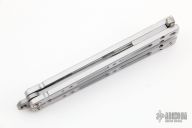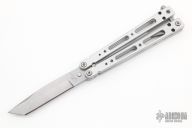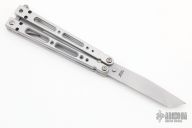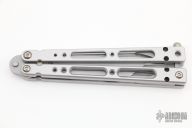 The Butterfly knife by Bear OPS. It is a lightweight flipper that is designed to be your go-to everyday carry knife. This B-410 model features silver aluminum handles, stainless steel spacers and a spring latch. The pivots have 304 bearing surfaces and phosphorus bronze washers. The satin finished stainless steel blade has a double tang pin design for great performance. Has a few light scuffs, otherwise excellent condition. 14C28N steel
