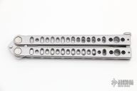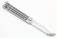 This Kimura 7 Balisong has a bead blasted clip pint blade. The handles are bead blasted stainless steel with latch at the butt. Latch can be reversed. Excellent condition.