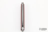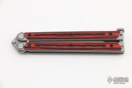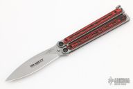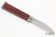 This Kimura 9 Balisong by Bradley Cutlery has a bead blasted drop point blade. The handles are bead blasted stainless steel with red/black G-10 overlays, T-latch at the butt. Latch can be reversed. Excellent condition.