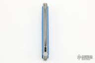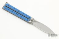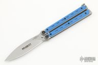 This Kimura 9 Balisong by Bradley Cutlery has a bead blasted drop point blade. The handles are bead blasted stainless steel with blue G-10 overlays, T-latch at the butt. Latch can be reversed. Excellent condition.