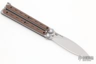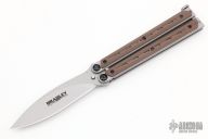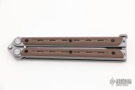 This Kimura 9 Balisong by Bradley Cutlery has a bead blasted drop point blade. The handles are bead blasted stainless steel with brown G-10 overlays, T-latch at the butt. Latch can be reversed. Excellent condition.