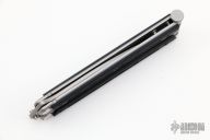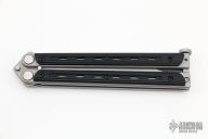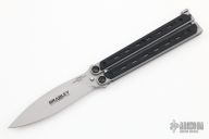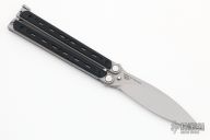 This Kimura 9 Balisong by Bradley Cutlery has a bead blasted drop point blade. The handles are bead blasted stainless steel with black G-10 overlays, T-latch at the butt. Latch can be reversed. Excellent condition.