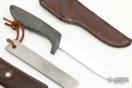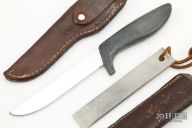 This Hunter by Gerber has a satin finished high-speed tool steel/ hard chrome plated @ C 60-62 blade with hidden tang, .060"blade stock and .740" blade depth. Handle is black Armorhide. Has scratches, has been resharpened, otherwise good condition. Comes with Gerber brown leather sheath and original sharpening steel with its own leather sheath.