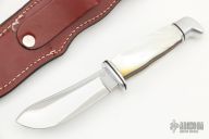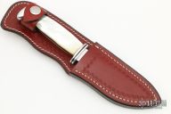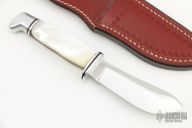 This Custom Buck Model 103 features a mirror polished blade with .177" blade stock and 1.166" blade depth, hidden tang construction. The handle has an aluminum guard and butt, mother of pearl scales with black liners and wood frame. Comes with a hand tooled brown leather sheath.