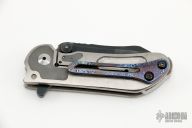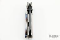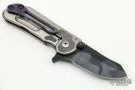 This Mini M8 Flipper by Direware Custom Knives features a Black Camo finished blade with swedge, notched thumbrest, and flipper. The handle has a satin finished titanium frame with dual etched Damasteel bolster inlays, hardened stainless steel backspacer and tip up white timascus clip. Nice blade seating, detent and lock up, rides on bearings. New from maker.