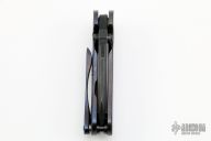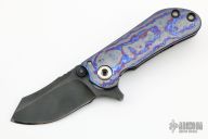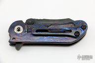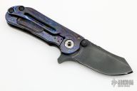 This Mini M8 Flipper by Direware Custom Knives features a Black finished blade with swedge, notched thumbrest, and flipper. The handle has a Black Timascus frame with zirconium barrel spacers and tip up Black Timascus clip. Nice blade seating, detent and lock up, rides on bearings. New from maker.