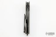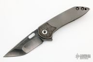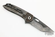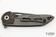 This SYJ-1 Flipper by Direware Custom Knives features a black satin finished blade with blasted flats, swedge, notched thumbrest, and flipper. The handle has a blasted titanium frame with dual 2-Day Etched Damasteel bolster inlays, hardened stainless steel backspacer and tip up zirconium clip. Nice blade seating, detent and lock up, rides on bearings. New from maker.