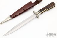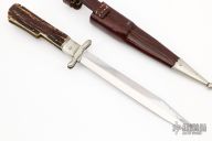 This Antique Folding Pig Sticker (I don't know if that is really what its called, but it seems appropriate, feel free to send me an email if you have more info) by Gebr. Weyersberg features a satin finished clip point blade with mirror polished flats and false top edge. The handle has folding nickel silver swing guard, nickel silver bolsters, stag scales, brass liners, polished steel backspacer with nickel silver lever lock. Comes with original brown leather sheath. Has some light scratches and patina, otherwise excellent condition for an old antique knife.