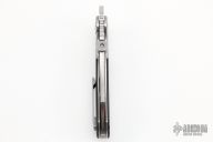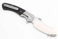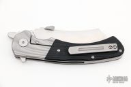 This DAO framelock flipper by Krudo Knives features a satin finished blade with knurled thumbdisc, notched thumbrest and flipper. The handle has a milled and tumbled titanium frame with black G-10 scales, stainless steel backspacer and tip up reversible stainless steel clip. Rides on bearings, nice detent, lockup and blade seating. Excellent condition.