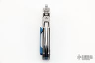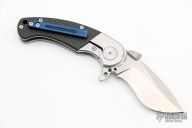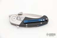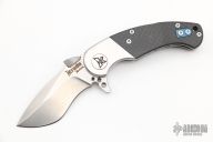 This IOTA by Krudo Knives features a satin finished recurve blade with notched thumbrest, large thumbdisc and flipper. The handle has a stainless steel frame with integral bolsters/liners, carbon fiber scales, blue coated stainless steel backspacer, tip up clip and filler tab. Excellent condition. Comes with nylon belt sheath.