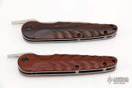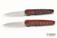 This Pair of Higonokami Style Linerlock by Hikari Japan feautres a satin finished blade with friction folder style opening and notched thumbrest. The handle has cocbolo scales with stainless steel liners and hardware. Nice detent, lockup and blade seating. Excellent condition.