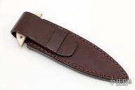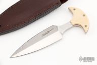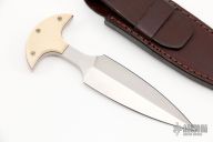 We have made This A.G. Russell Shopmade push dagger letter openers with both giraffe bone scales. Push Daggers were highly favored by gamblers on the early riverboats and in the gold fields of California and Nevada, where they were carried concealed, usually along with a derringer, as protection. Ours was designed for a much less adventurous life. Along with the elegant, deep chocolate brown leather sheath, you’ll not find a letter opener that will generate more interest. The knives are made in our own shop here in Rogers, Arkansas and are marked A.G. Russell™ Shopmade®. The blades are 154CM at 57-59 Rc. The mammoth ivory scales are held in place by mosaic pins and red liners. The leather desktop sheath is made offshore to our design. Excellent condition.